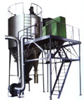 空氣經(jīng)過濾和加熱,進入干燥器頂部空氣分配器,熱空氣呈螺旋狀均勻地進入干燥室。料液經(jīng)塔體頂部的高速離心霧化器,(旋轉(zhuǎn))噴霧成細微的霧狀液珠,與熱空氣并流接觸在短的時間內(nèi)可干燥為成品。成品連續(xù)地由干燥塔底部和旋風(fēng)分離器中輸出,廢氣由風(fēng)機排空。