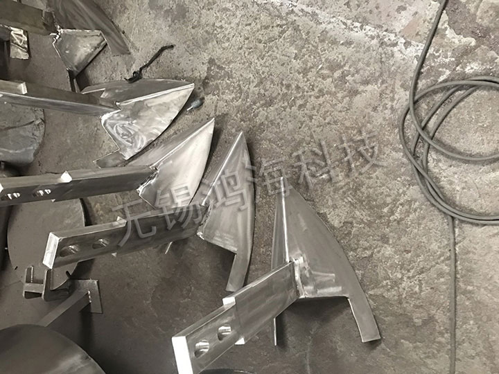 飛刀組由多把飛刀組成,通過電機(jī)直接驅(qū)動(dòng),安裝在筒體側(cè)面,防止粉塵進(jìn)入軸承,飛刀軸采用多道密封結(jié)構(gòu);